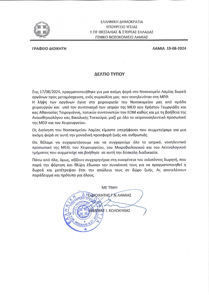 ΔΕΛΤΙΟ ΤΥΠΟΥ - ΔΩΡΕΑ ΟΡΓΑΝΩΝ