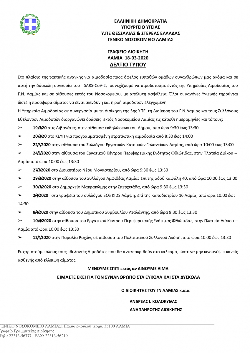 ΔΕΛΤΙΟ ΤΥΠΟΥ - ΔΡΑΣΕΙΣ ΑΙΜΟΔΟΣΙΑΣ ΕΚΤΟΣ ΝΟΣΟΚΟΜΕΙΟΥ