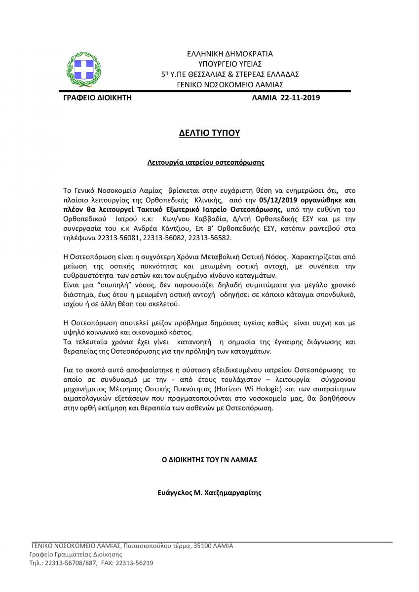 ΔΕΛΤΙΟ ΤΥΠΟΥ - ΕΝΑΡΞΗ ΙΑΤΡΕΙΟΥ ΟΣΤΕΟΠΟΡΩΣΗΣ