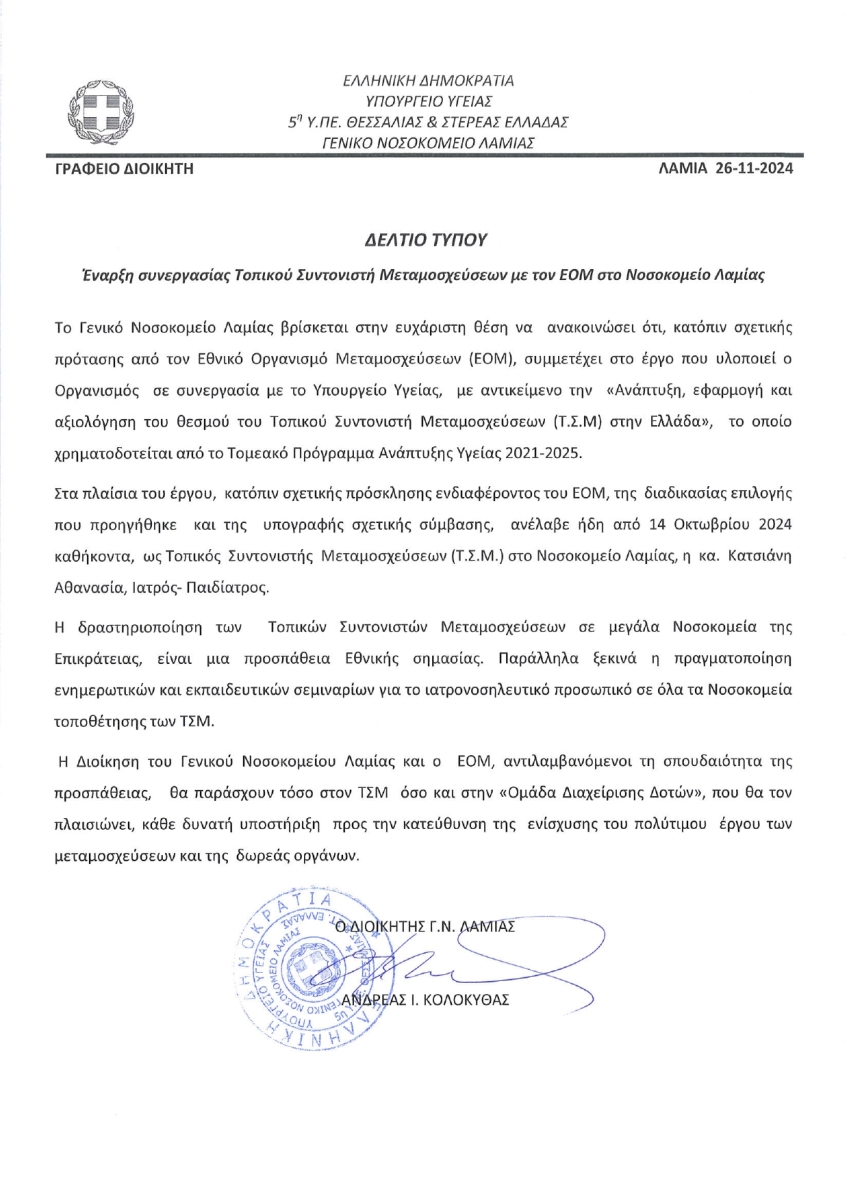ΔΕΛΤΙΟ ΤΥΠΟΥ - ΕΝΑΡΞΗ ΣΥΝΕΡΓΑΣΙΑΣ ΤΟΠΙΚΟΥ ΣΥΝΤΟΝΙΣΤΗ ΜΕ ΤΟΝ ΕΟΜ