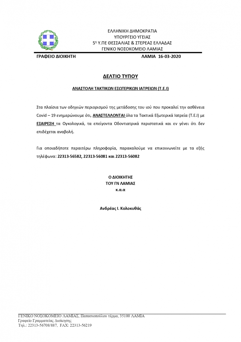 ΔΕΛΤΙΟ ΤΥΠΟΥ ΓΙΑ ΑΝΑΣΤΟΛΗ ΤΑΚΤΙΚΩΝ ΕΞΩΤΕΡΙΚΩΝ ΙΑΤΡΕΙΩΝ (Τ.Ε.Ι)