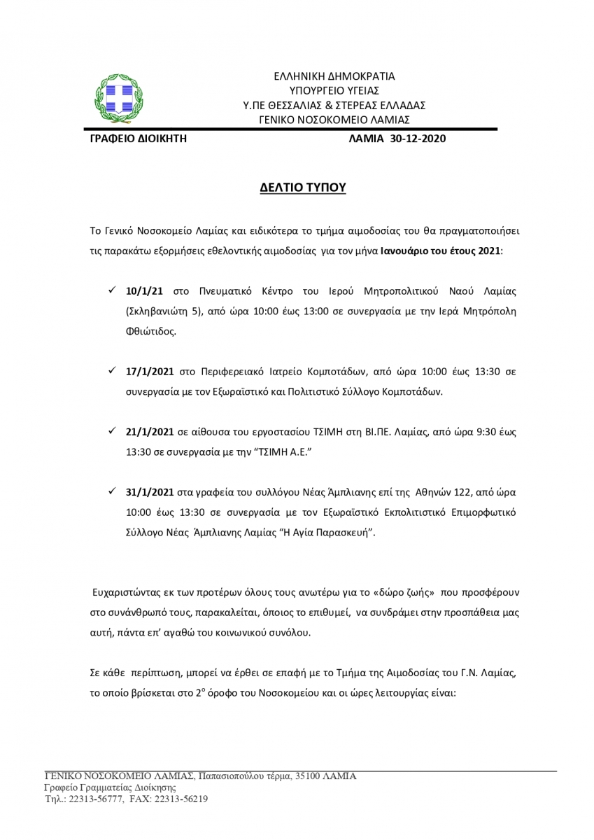 ΔΕΛΤΙΟ ΤΥΠΟΥ ΓΙΑ ΔΡΑΣΕΙΣ ΑΙΜΟΔΟΣΙΑΣ ΙΑΝΟΥΑΡΙΟΥ 2021