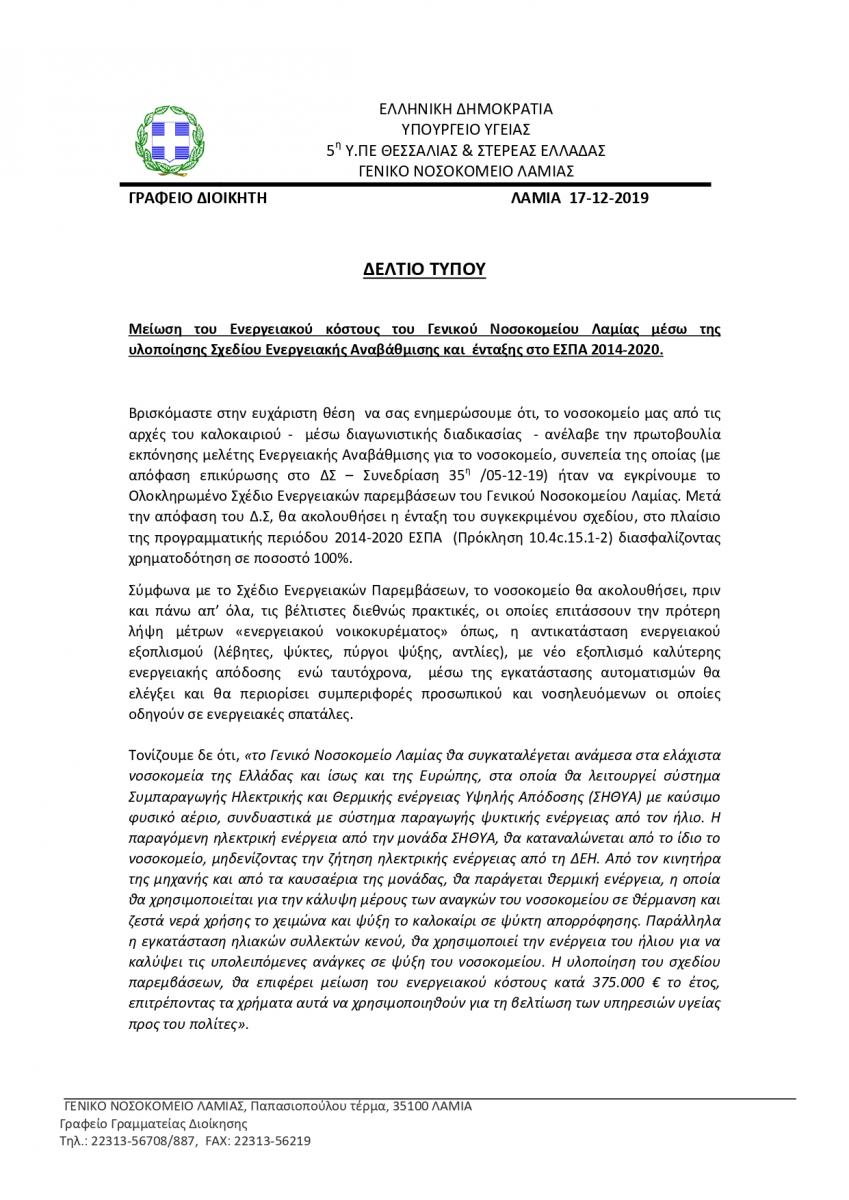 ΔΕΛΤΙΟ ΤΥΠΟΥ ΓΙΑ ΕΝΕΡΓΕΙΑΚΗ ΑΝΑΒΑΘΜΙΣΗ ΓΝ ΛΑΜΙΑΣ