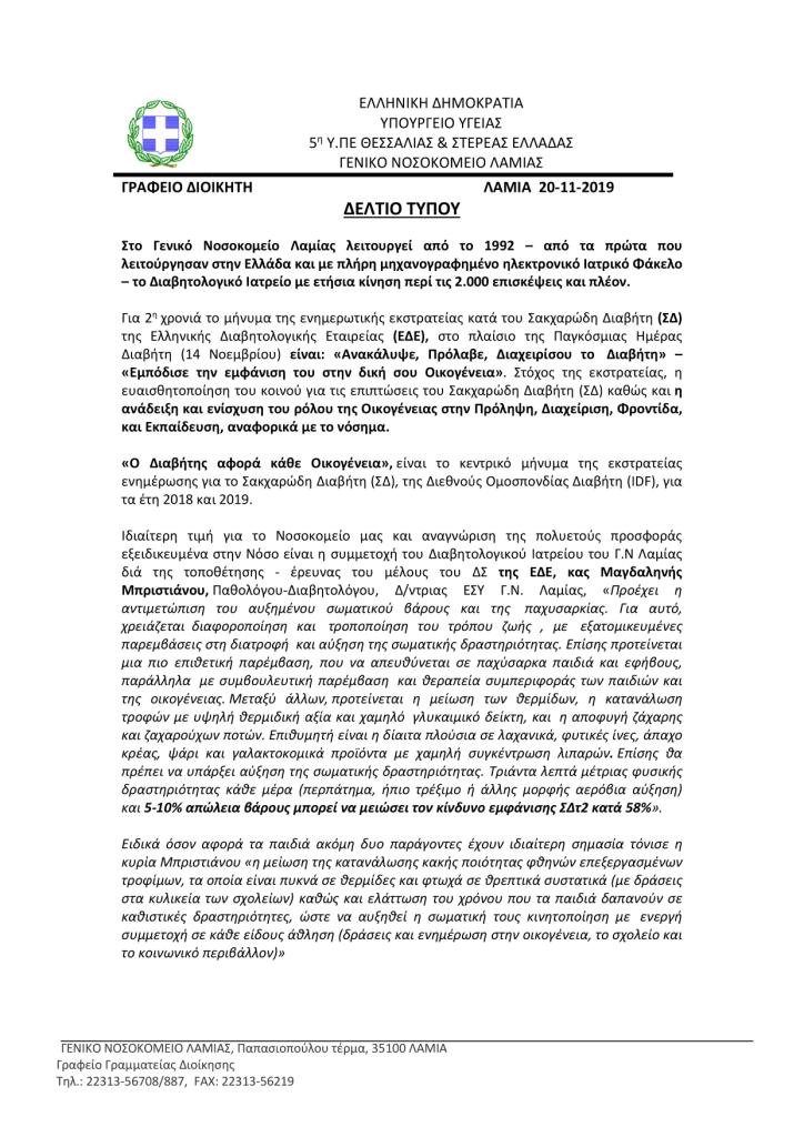 ΔΕΛΤΙΟ ΤΥΠΟΥ ΓΙΑ ΠΑΓΚΟΣΜΙΑ ΗΜΕΡΑ ΔΙΑΒΗΤΗ