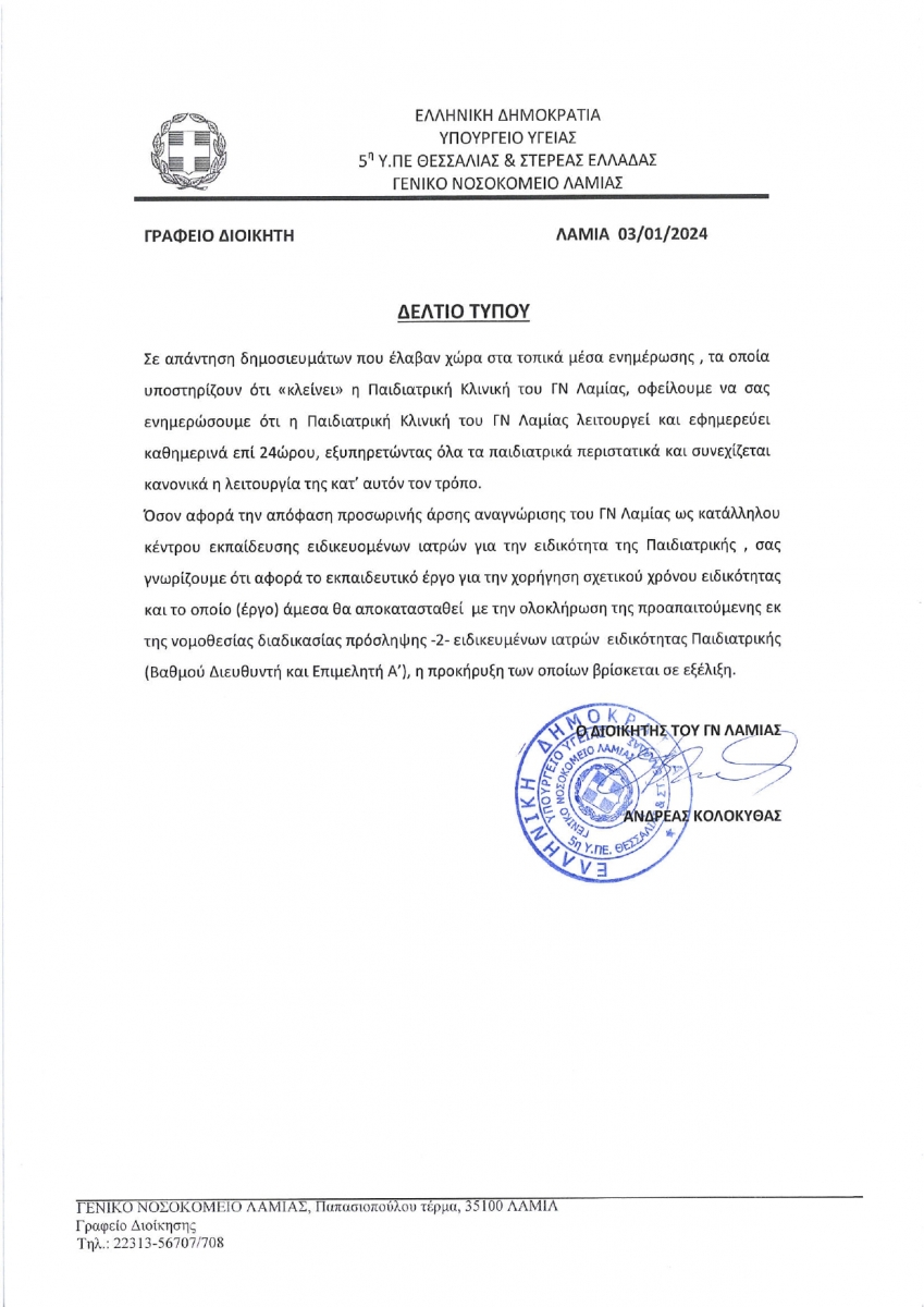 ΔΕΛΤΙΟ ΤΥΠΟΥ - ΛΕΙΤΟΥΡΓΙΑ ΠΑΙΔΙΑΤΡΙΚΗΣ ΚΛΙΝΙΚΗΣ
