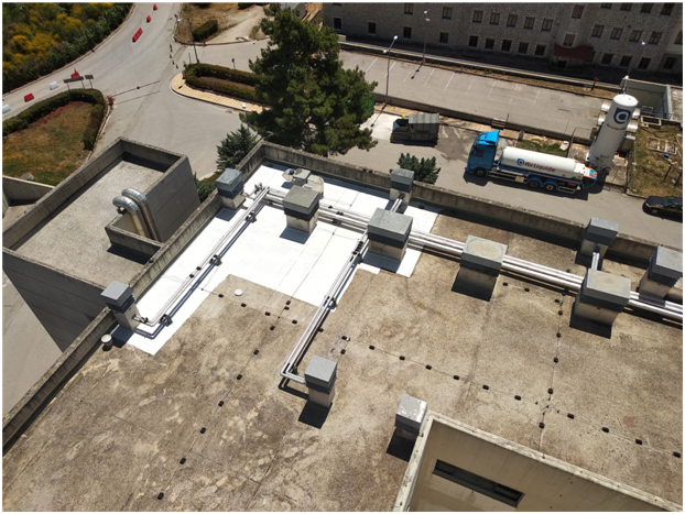 2.Στο δώμα του 2ου ορόφου (πάνω από το Παθολογοανατομικό τμήμα) έγινε αστάρωμα τμήματος επιφάνειας του δώματος με εποξειδικό αστάρι AQUADUR και εφαρμογή δύο στρώσεων μονωτικού υλικού HYPERDESMO.