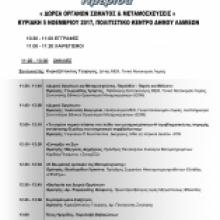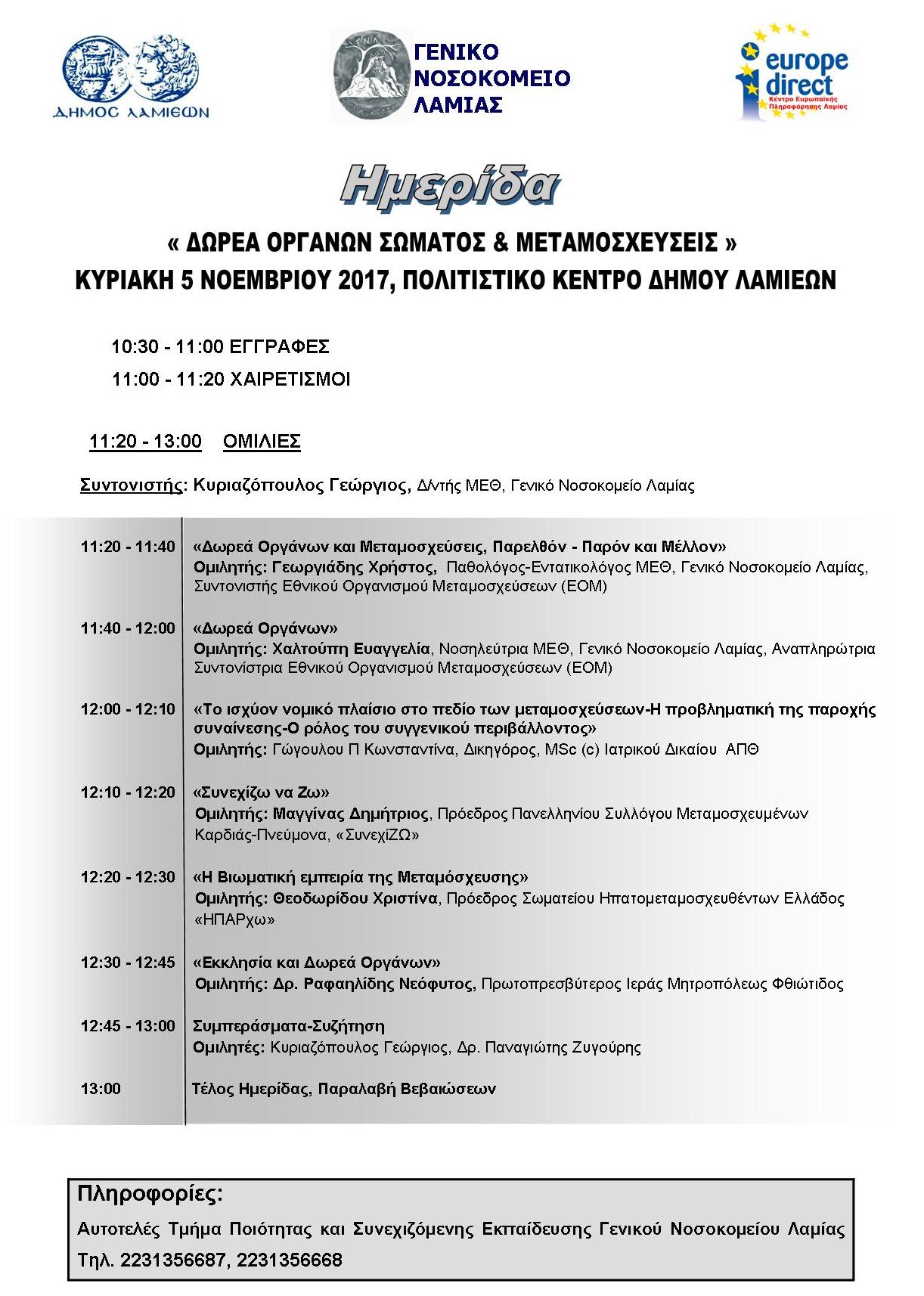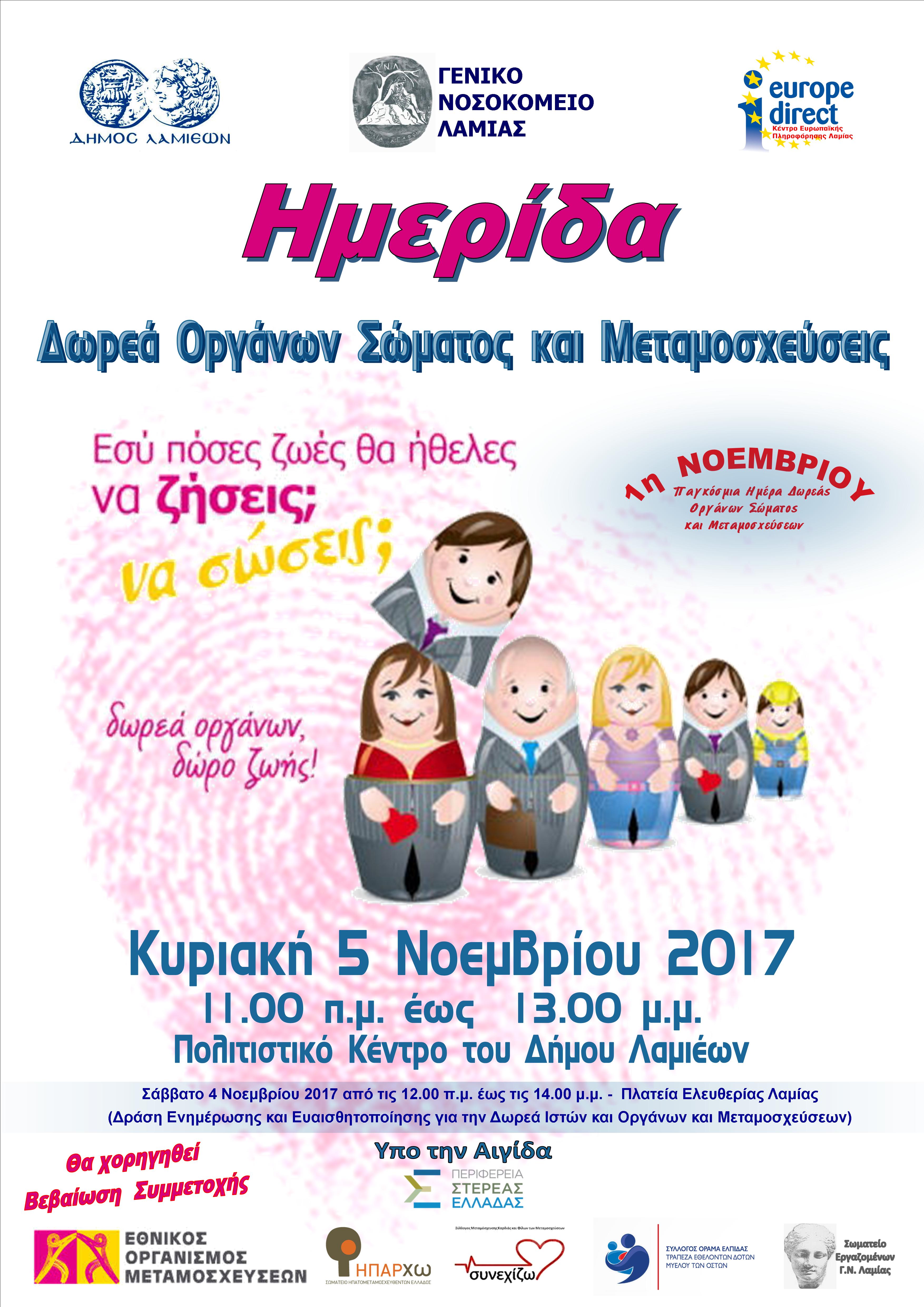 Στίς 5 Νοεμβρίου 2017, στο χώρο του Πολιτιστικού Κέντρου του Δήμου Λαμιεων, θα πραγματοποιηθεί εκδήλωση με θεμα - ΔΩΡΕΑ ΟΡΓΑΝΩΝ ΣΩΜΑΤΟΣ ΚΑΙ ΜΕΤΑΜΟΣΧΕΥΣΕΙΣ.