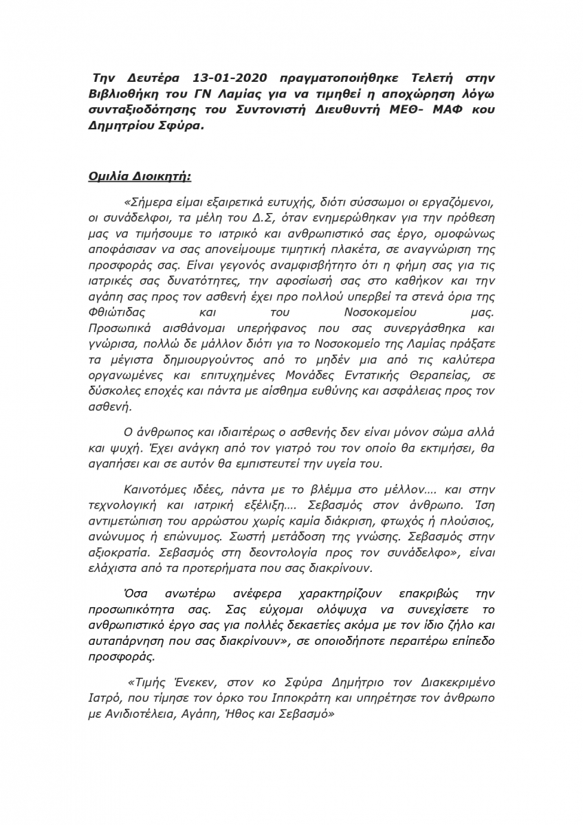ΤΗ ΔΕΥΤΕΡΑ 13-01-2020 ΠΡΑΓΜΑΤΟΠΟΙΗΘΗΚΕ ΤΕΛΕΤΗ ΣΤΗΝ ΒΙΒΛΙΟΘΗΚΗ ΤΟΥ ΓΝ ΛΑΜΙΑΣ ΓΙΑ ΝΑ ΤΙΜΗΘΕΙ Η ΑΠΟΧΩΡΗΣΗ ΛΟΓΩ ΣΥΝΤΑΞΙΟΔΟΤΗΣΗΣ ΤΟΥ ΣΥΝΤΟΝΙΣΤΗ ΔΙΕΥΘΥΝΤΗ ΜΕΘ-ΜΑΦ κου ΔΗΜΗΤΡΙΟΥ ΣΦΥΡΑ.