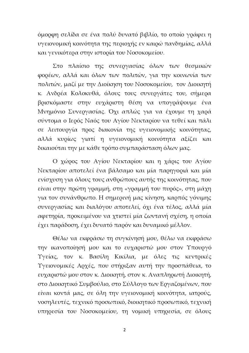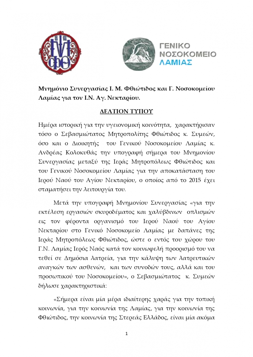 ΜΝΗΜΟΝΙΟ ΣΥΝΕΡΓΑΣΙΑΣ Ι.Μ.ΦΘΙΩΤΙΔΟΣ ΚΑΙ Γ.ΝΟΣΟΚΟΜΕΙΟΥ ΛΑΜΙΑΣ ΓΙΑ ΤΟΝ Ι.Ν.ΑΓ.ΝΕΚΤΑΡΙΟΥ