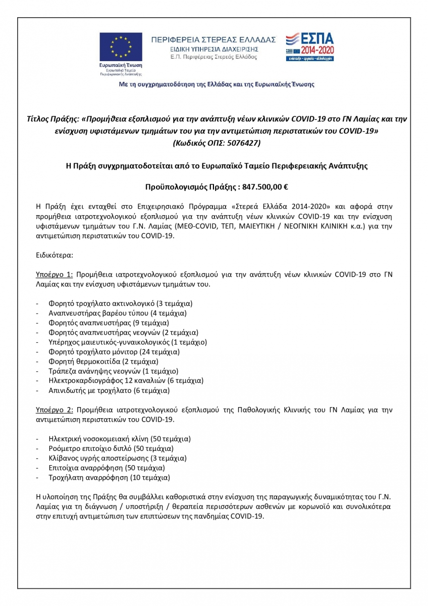 Προμήθεια εξοπλισμού για την ανάπτυξη νέων κλινικών COVID-19