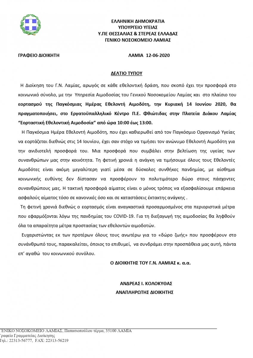 ΔΕΛΤΙΟ ΤΥΠΟΥ ΑΙΜΟΔΟΣΙΑΣ (ΓΙΑ 14 ΙΟΥΝΙΟΥ 2020)