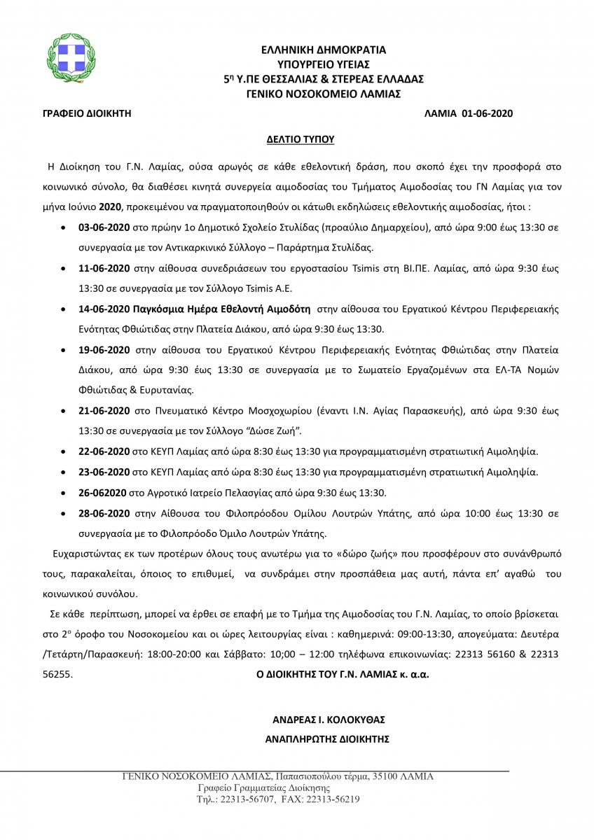 ΔΕΛΤΙΟ ΤΥΠΟΥ ΑΙΜΟΔΟΣΙΑΣ (ΓΙΑ ΙΟΥΝΙΟ 2020)