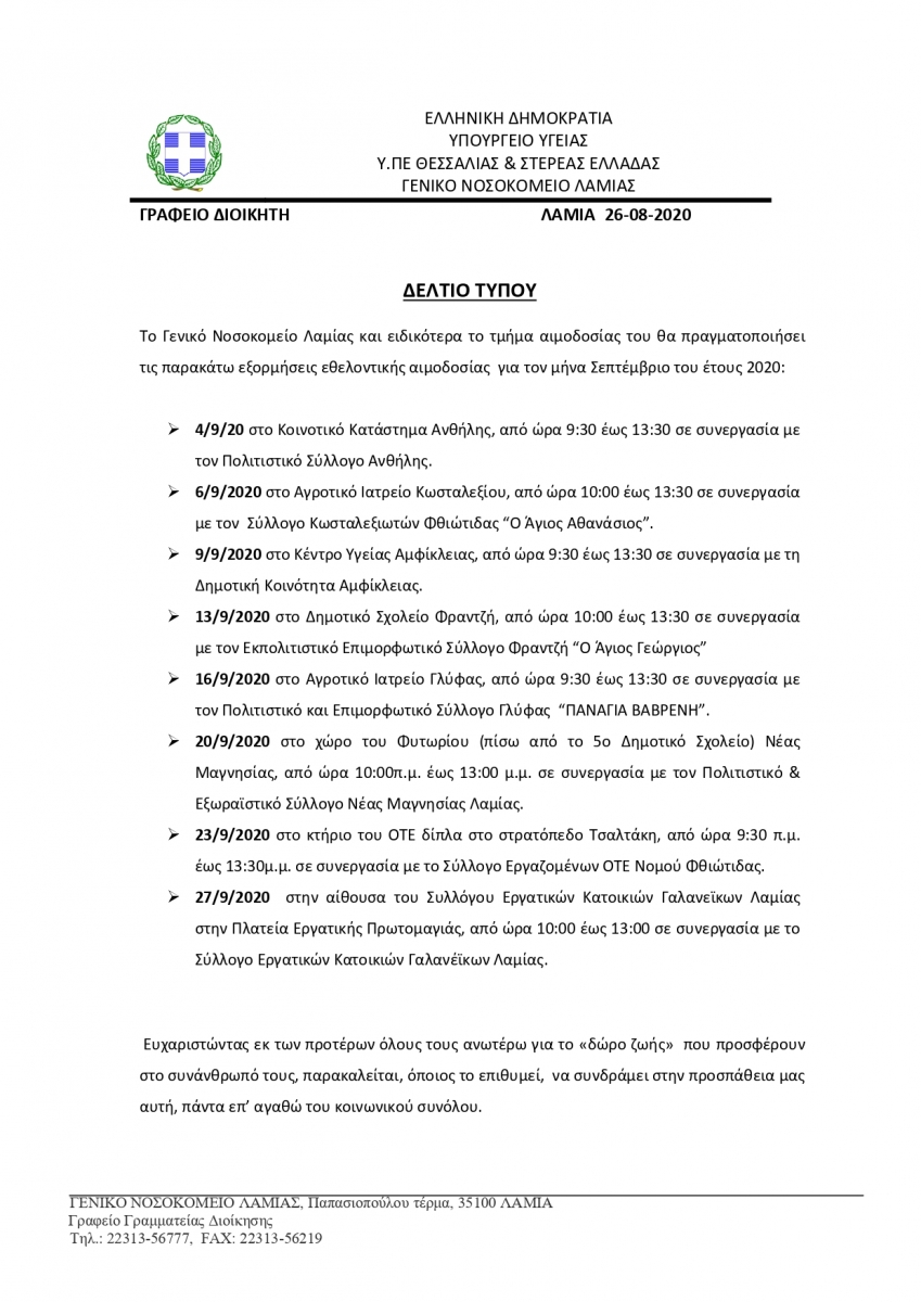 ΔΕΛΤΙΟ ΤΥΠΟΥ ΑΙΜΟΔΟΣΙΑΣ ΣΕΠΤΕΜΒΡΙΟΣ 2020