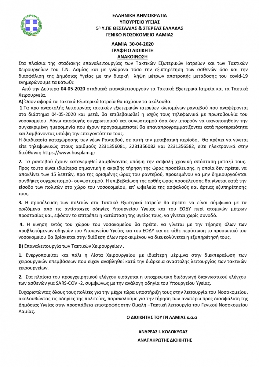 ΑΝΑΚΟΙΝΩΣΗ - ΣΤΑΔΙΑΚΗ ΕΠΑΝΑΛΕΙΤΟΥΡΓΙΑ ΤΩΝ ΤΑΚΤΙΚΩΝ ΕΞΩΤΕΡΙΚΩΝ ΙΑΤΡΕΙΩΝ ΚΑΙ ΤΩΝ ΤΑΚΤΙΚΩΝ ΧΕΙΡΟΥΡΓΕΙΩΝ