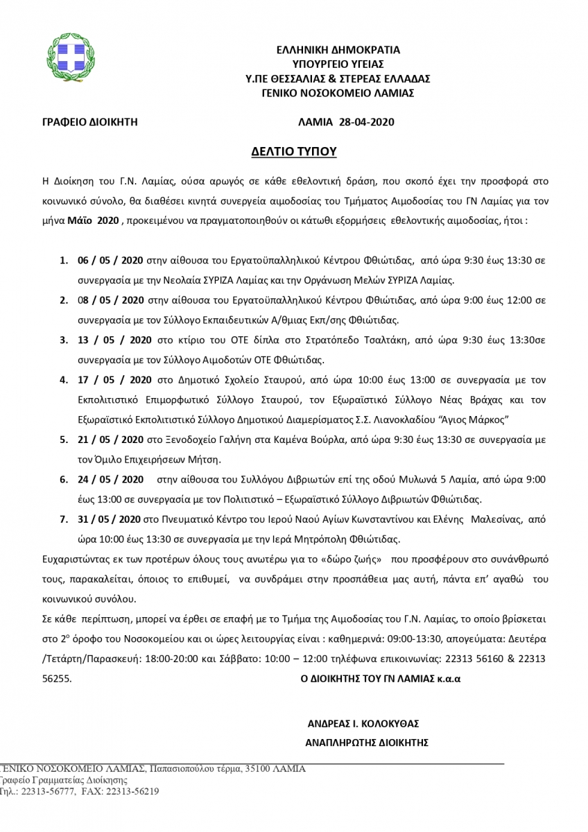 ΔΕΛΤΙΟ ΤΥΠΟΥ ΑΙΜΟΔΟΣΙΑΣ ΜΑΪΟΣ 2020