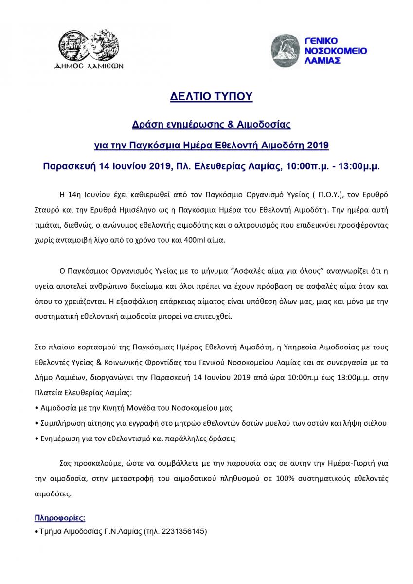ΔΕΛΤΙΟ ΤΥΠΟΥ - ΔΡΑΣΗ ΓΙΑ ΤΗΝ ΠΑΓΚΟΣΜΙΑ ΗΜΕΡΑ ΕΘΕΛΟΝΤΗ ΑΙΜΟΔΟΤΗ