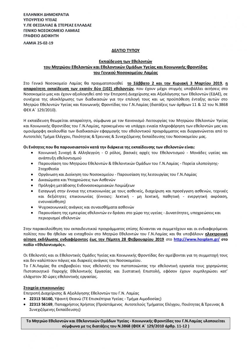 ΔΕΛΤΙΟ ΤΥΠΟΥ - ΕΚΠΑΙΔΕΥΣΗ ΕΘΕΛΟΝΤΩΝ ΤΟΥ Γ.Ν. ΛΑΜΙΑΣ