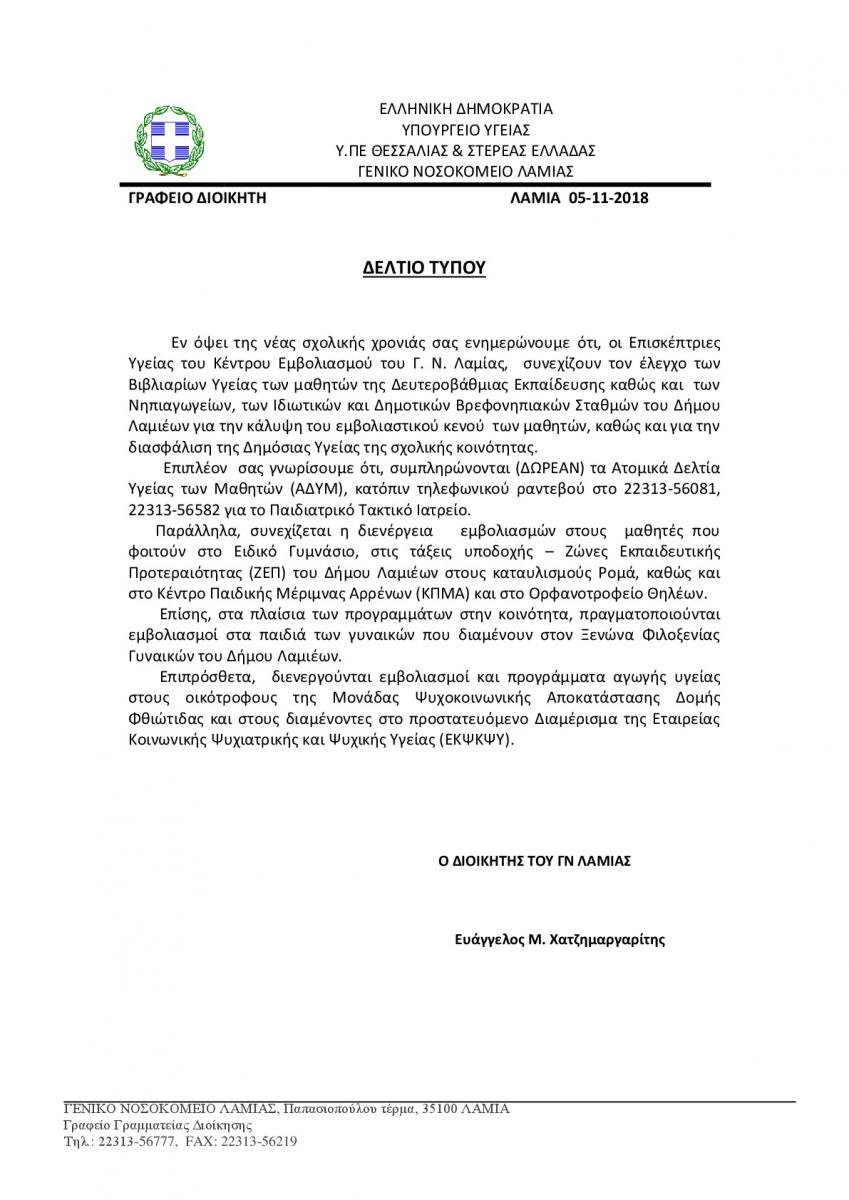 ΔΕΛΤΙΟ ΤΥΠΟΥ - ΚΕΝΤΡΟ ΕΜΒΟΛΙΑΣΜΟΥ
