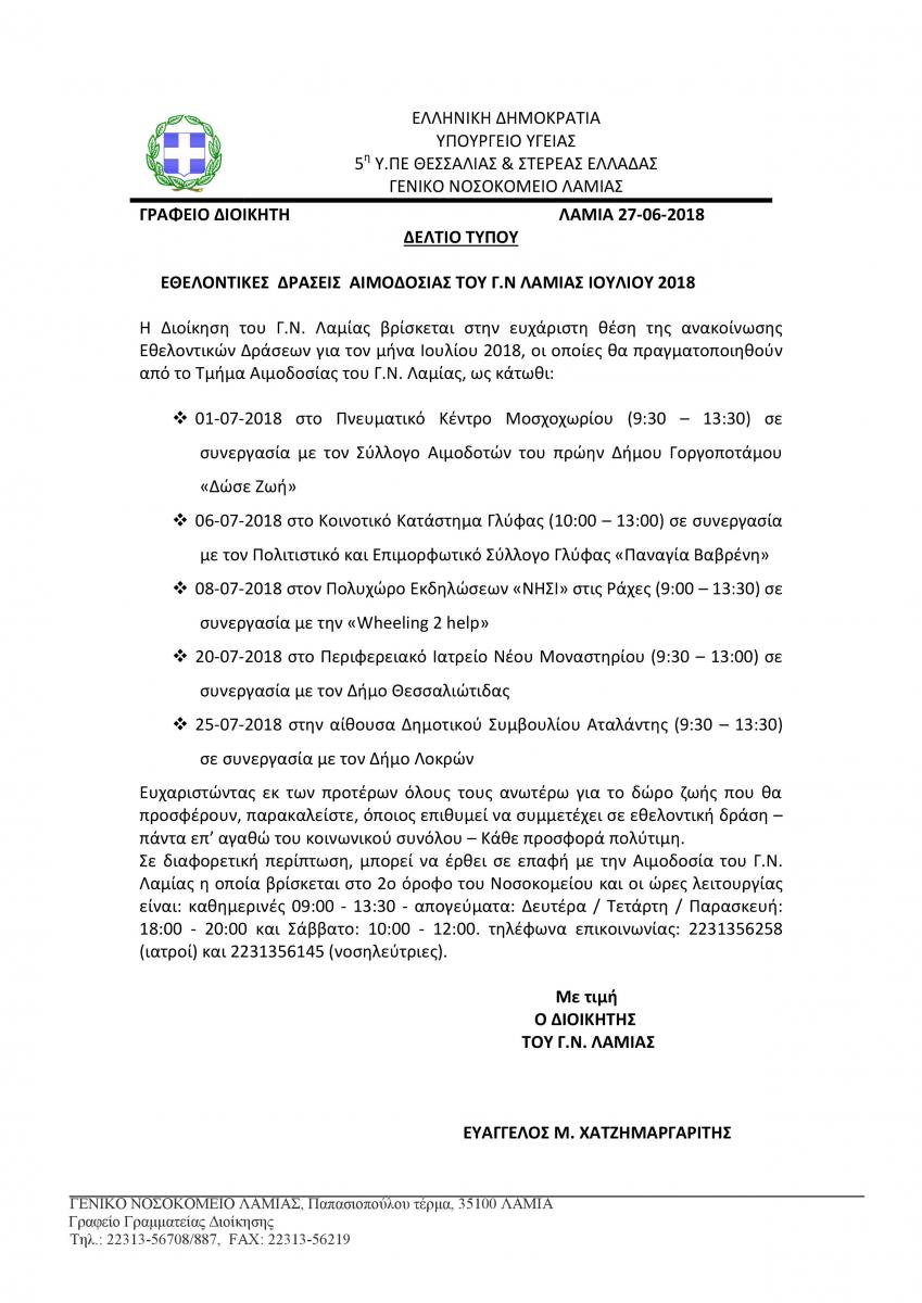 ΕΘΕΛΟΝΤΙΚΕΣ ΔΡΑΣΕΙΣ ΑΙΜΟΔΟΣΙΑΣ ΤΟΥ Γ.Ν. ΛΑΜΙΑΣ IOYΛIOY 2018