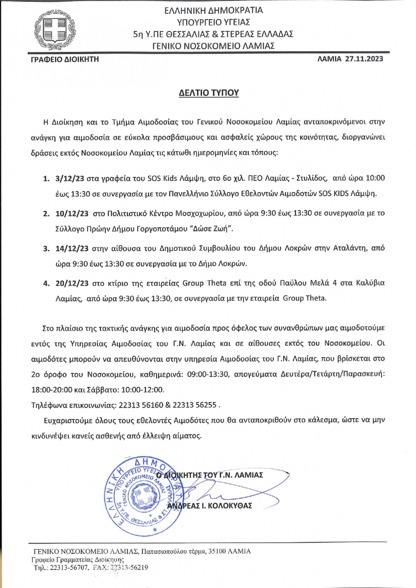 εφημερίας)για το ΤΕΠ ,με το ΝΠΔΔ με την επωνυμία Γενικό Νοσοκομείο Λαμίας, με καθεστώς
