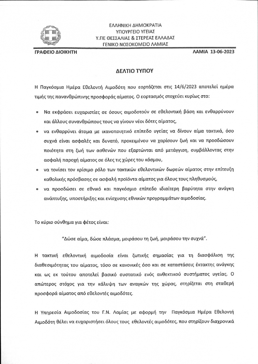 ΔΕΛΤΙΟ ΤΥΠΟΥ - ΠΑΓΚΟΣΜΙΑ ΗΜΕΡΑ ΕΘΕΛΟΝΤΗ ΑΙΜΟΔΟΤΗ