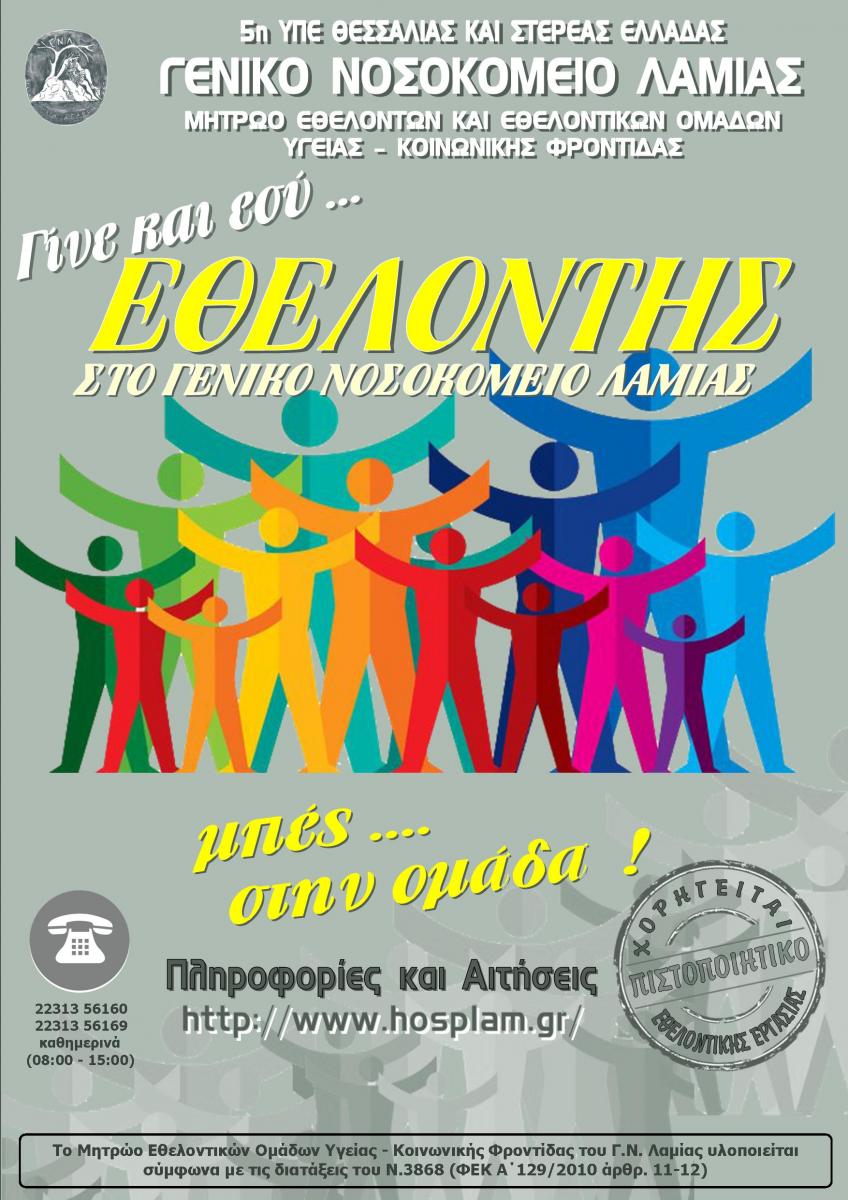 Αξιοποιώντας τις δυνατότητες που προσφέρονται από την ισχύουσα νομοθεσία σχετικά με την «Αναβάθμιση του Εθνικού Συστήματος Υγείας» (διατάξεις των άρθρων 11 & 12 του Ν.3868 ΦΕΚ Α΄ 129/2010) το Γ.Ν. Λαμίας με την αριθμ. 21/18-9-18 θέμα 4ο απόφαση του Διοικητικού του Συμβουλίου, προχωρά στη δημιουργία Μητρώου Εθελοντών και Εθελοντικών Ομάδων Υγείας - Κοινωνικής Φροντίδας.